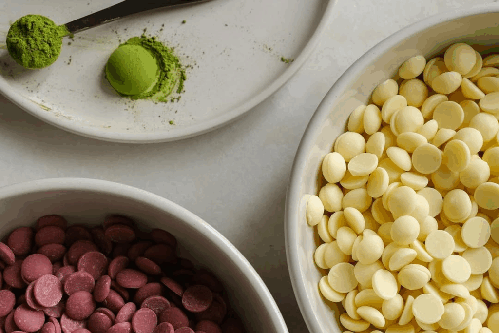 - Pegue aproximadamente um terço de uma colher de chá de chocolate Matcha da tigela pequena e misture na tigela principal de chocolate branco para obter uma cor verde clara.