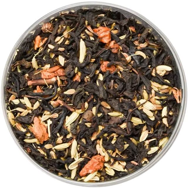 Chá preto, caramelo salgado, sementes de funcho, anis, pimenta preta, aroma natural, pedaços de maçã assada