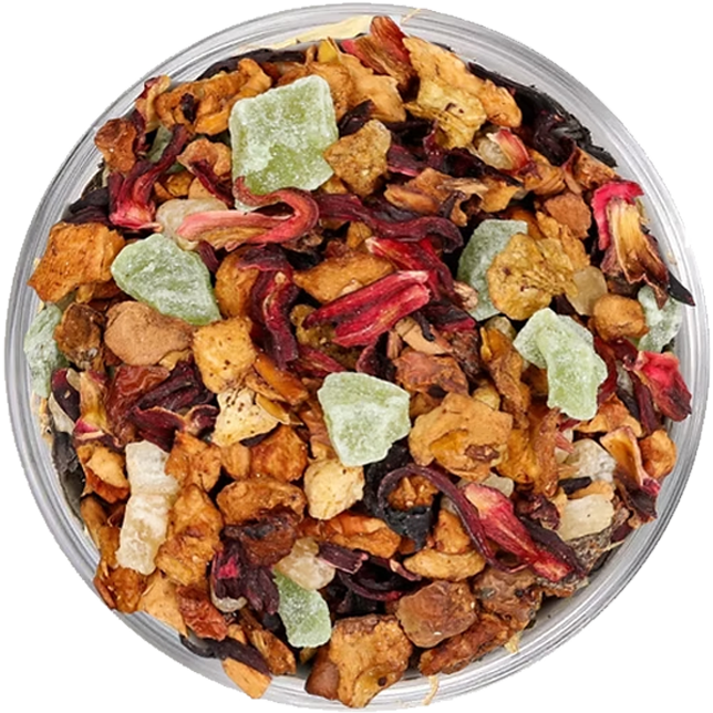 Este blend vibrante combina a leveza do chá verde com a doçura frutada de maçã, kiwi e abacaxi, equilibrado por um toque floral das flores de hibisco. Ao primeiro gole, sente-se a refrescância suave do chá verde, seguida pela acidez delicada do kiwi que desperta o paladar, enquanto os pedaços de abacaxi e maçã trazem um dulçor natural e suculento. O hibisco entra como um sutil fio condutor, realçando as notas frutadas com sua leve acidez e coloração viva. O resultado é uma infusão tropical, revigorante e levemente adstringente, que refresca, estimula e desperta os sentidos com uma sensação de leve euforia ensolarada.