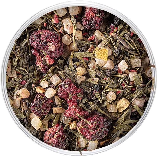 Chá Branco, coco, abacaxi, casca de limão, framboesas, e amoras.